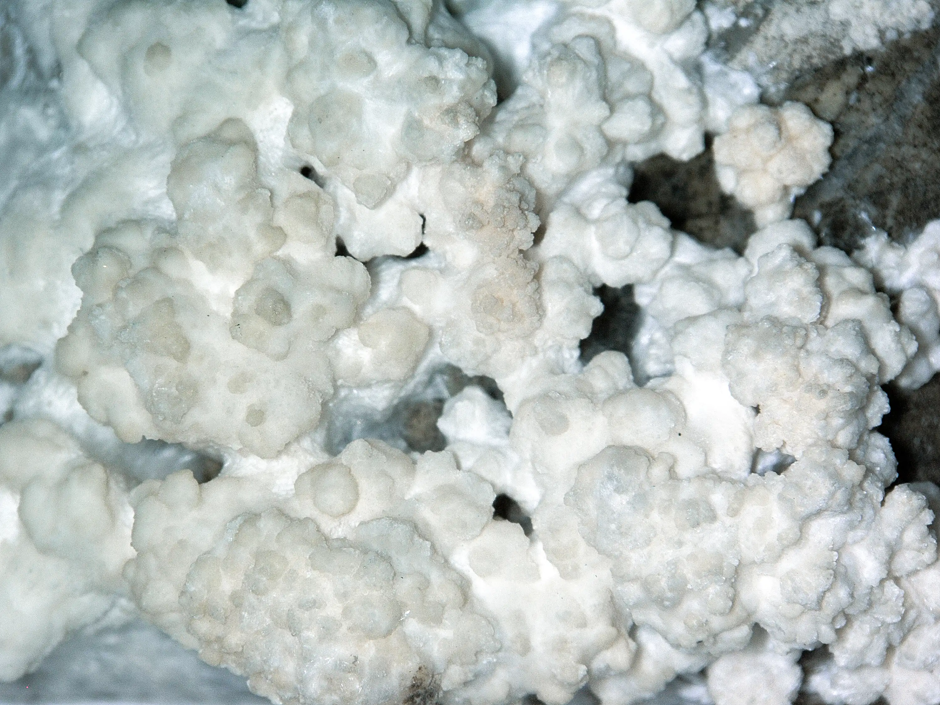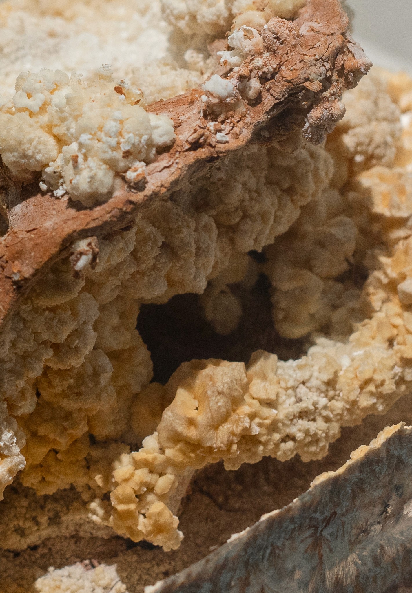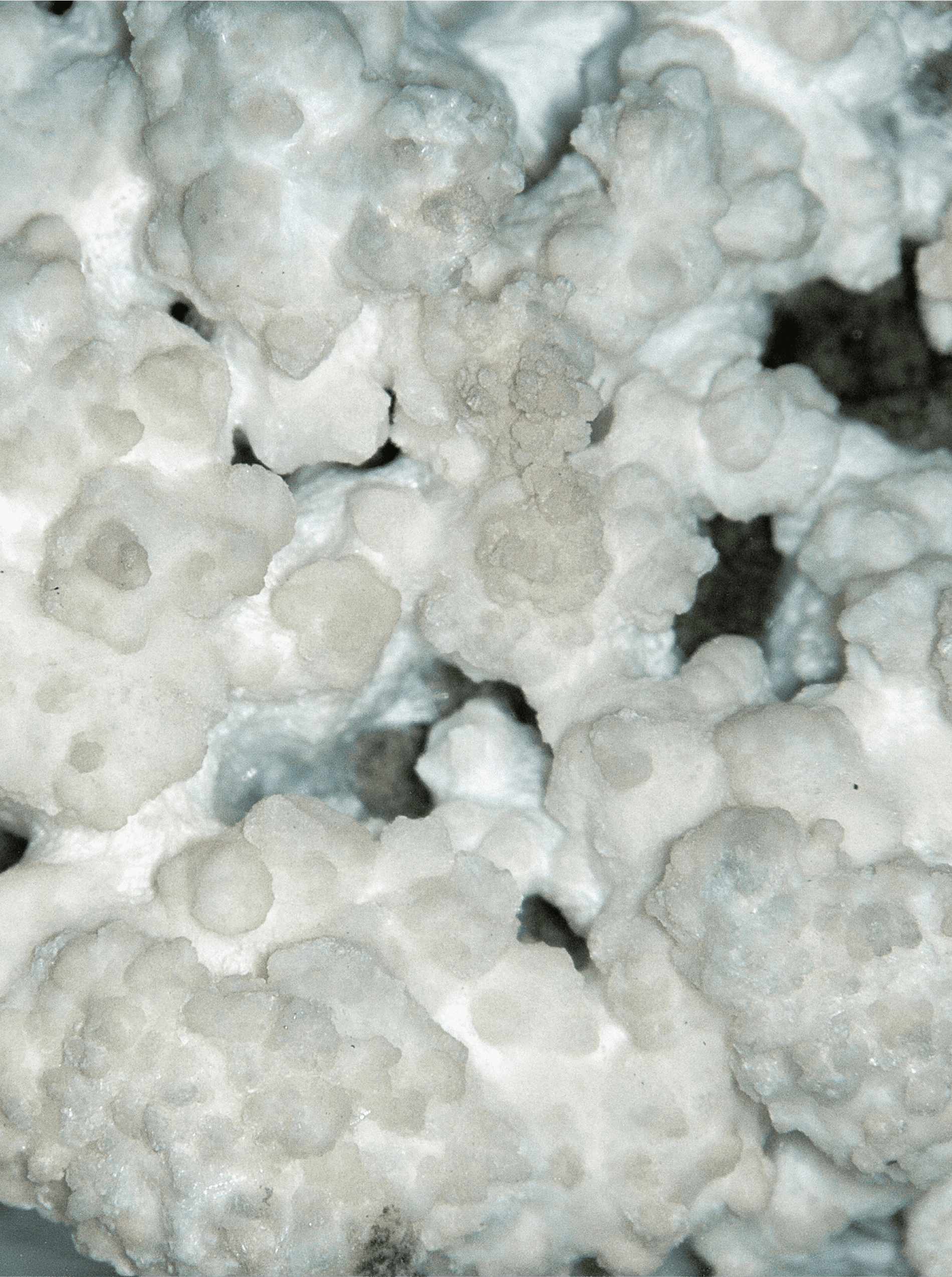 During the process of the project, research on reactions and growth was performed with different sediments and rocks, further applied into ceramic objects. The materials were tested in their raw state, but glazes and engobes with a high content of calcium rich materials were also tested on stoneware as can be seen on the first image below.